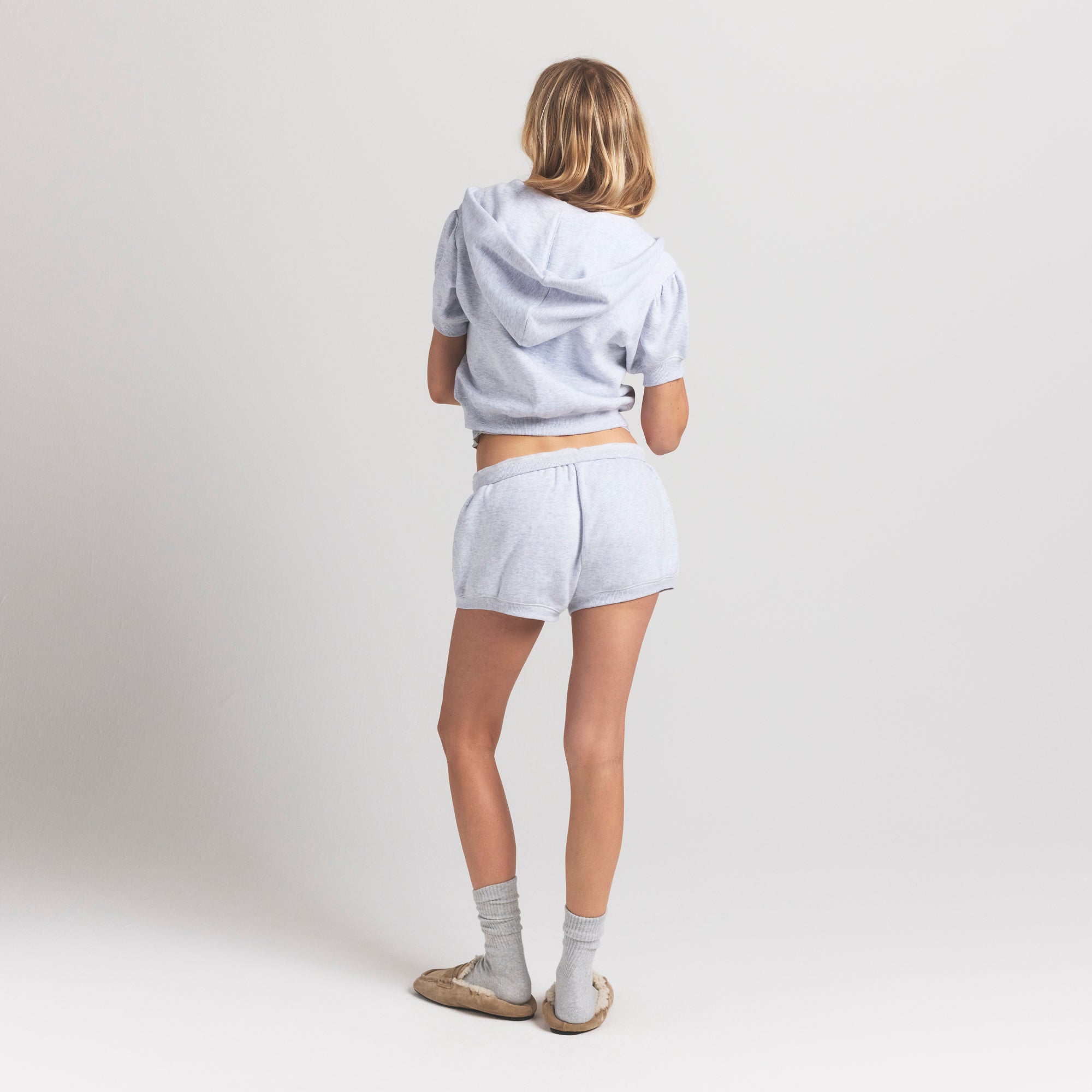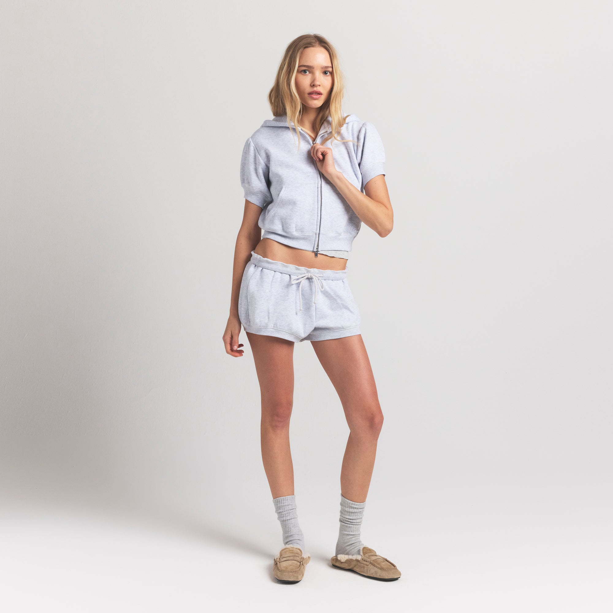 Soft fleece, standout sleeves. Made with our signature, plush fabric, this hooded cropped zip-up features puffy short sleeves and a two-way center zipper. Complete with a kangaroo pocket, embossed SKIMS logo, and ribbed details at the cuff and hem.