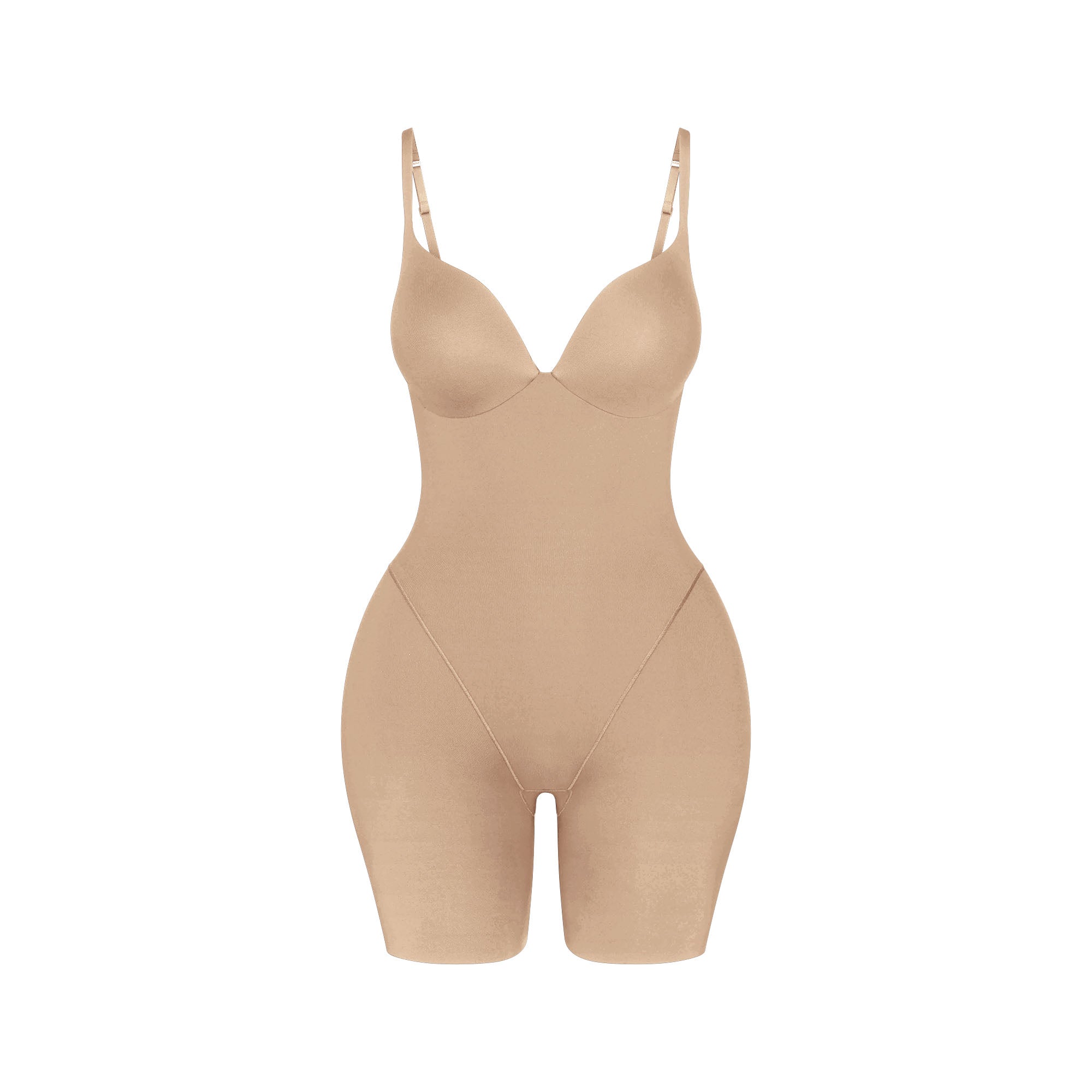 The ultimate SKIMS hourglass silhouette. This full-length catsuit combines our signature SKIMS Body contouring fabric with our viral Ultimate Bra technology for your best boobs and body. Features teardrop-shaped foam pads for a flawless bust and embedded pads at the hip and butt for lifting and volume. Made with mid-level compression and power mesh lining for added compression. Complete with adjustable straps and a closed gusset. Fits true to size.