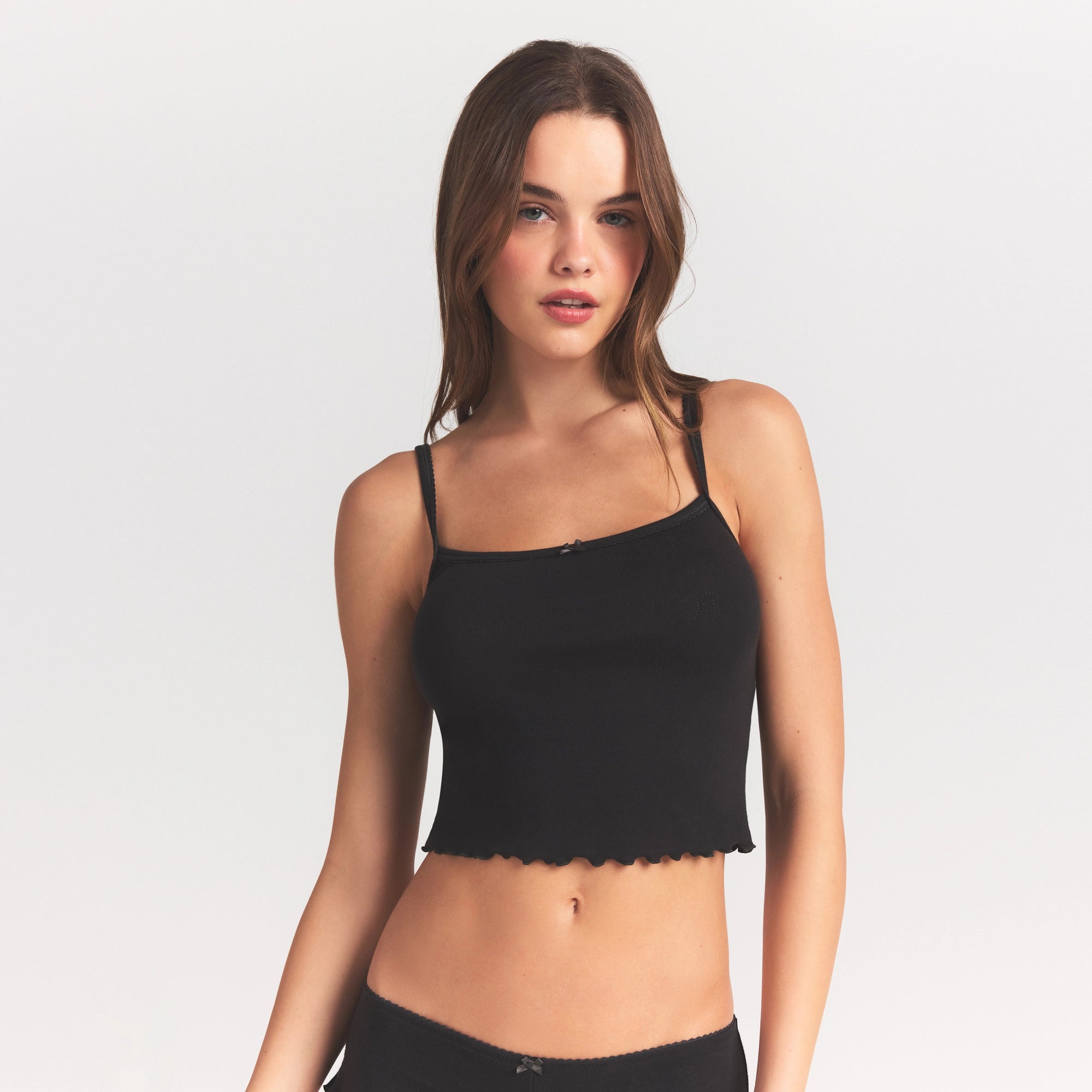 A matching set you’ll adore. Designed in our lightweight pointelle, this set includes a cropped scoop neck cami with adjustable straps, lettuce edge hem, and a satin bow detail. The short includes a picot elastic waistband, ruffle leg opening, satin bow detail, and 100% cotton gusset.