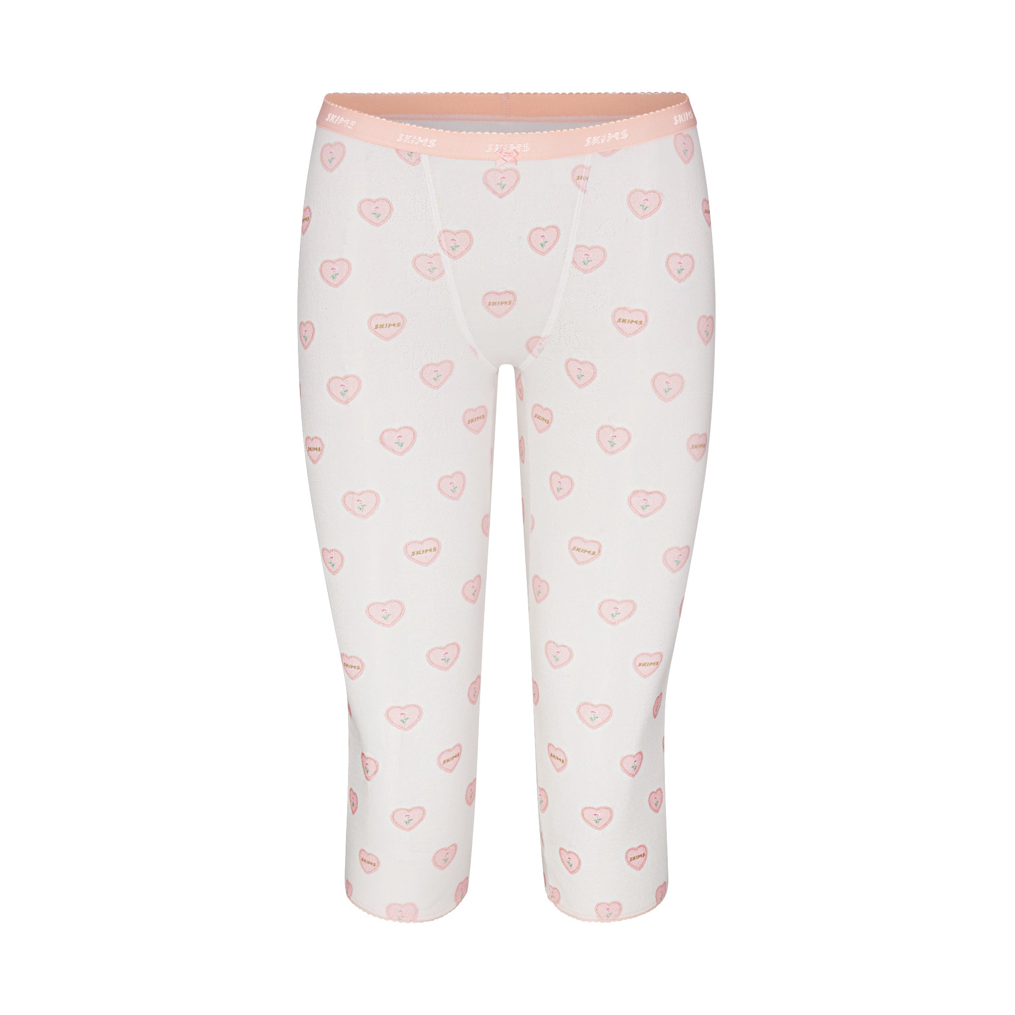 Soft and feminine in our lightweight knit pointelle, this mid-rise capri features a flattering v-panel detail, logo picot elastic waistband, and center bow detail.