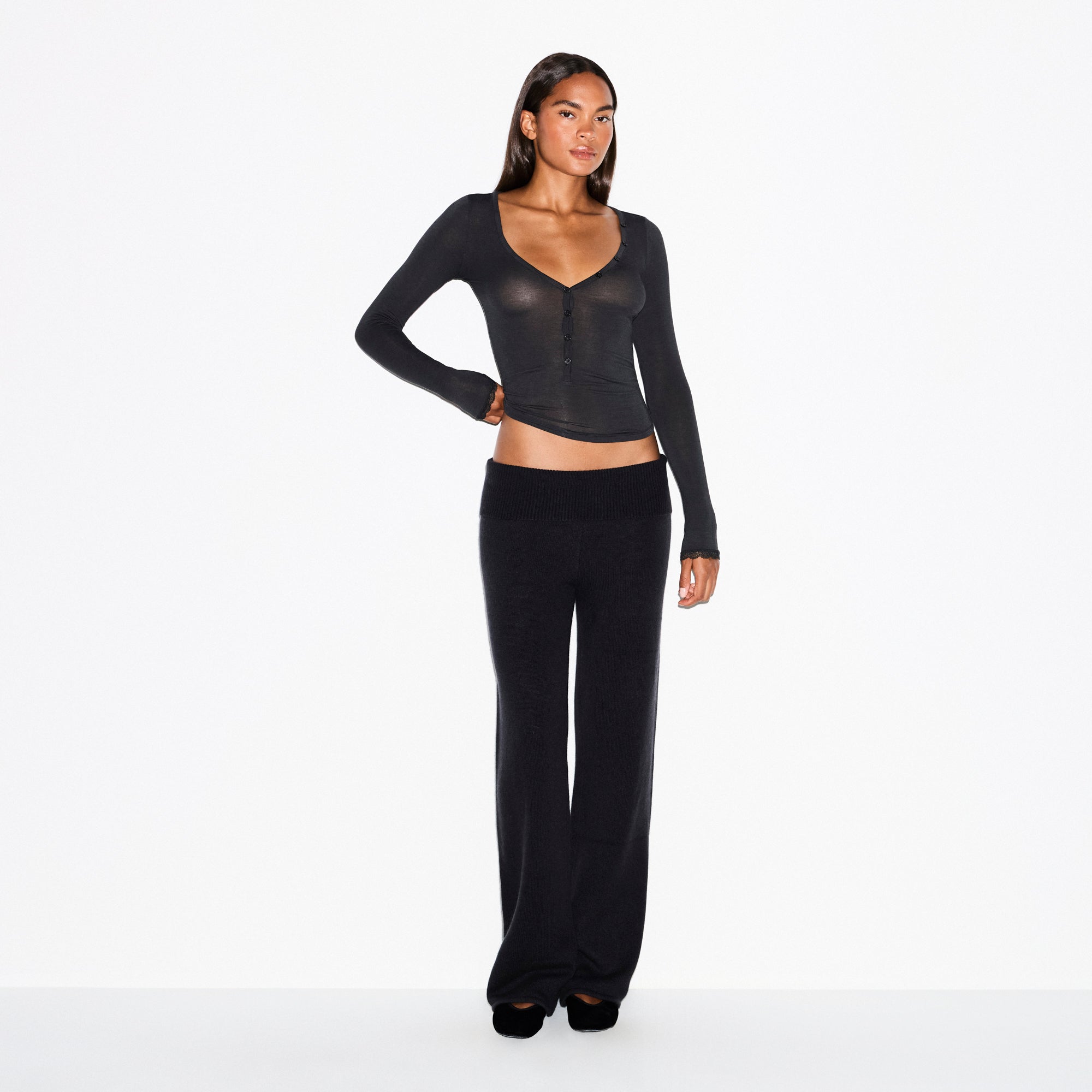 Featuring a sheer look and body-hugging fit, this long sleeve henley brings flattering, everyday comfort to your wardrobe. Made from our soft and stretchy modal-cashmere fabric. Fits true to size.