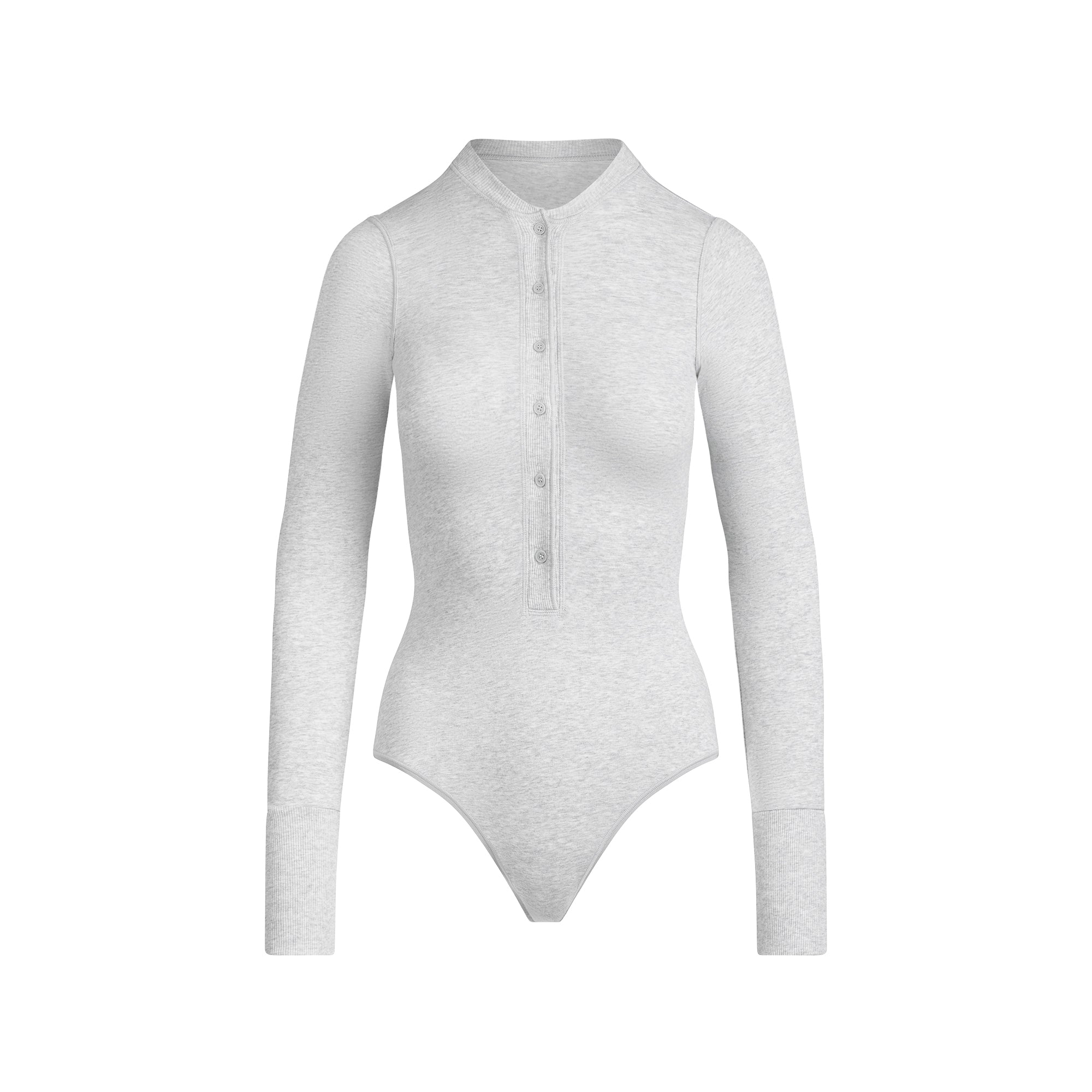 An ultra-flattering base. Made with our signature, stretchy Cotton Jersey, this long sleeve brief bodysuit features a deep plunge neckline with a henley button closure. Complete with ribbed details at the neckline and cuffs and a 100% cotton gusset with snaps. Fits true to size.