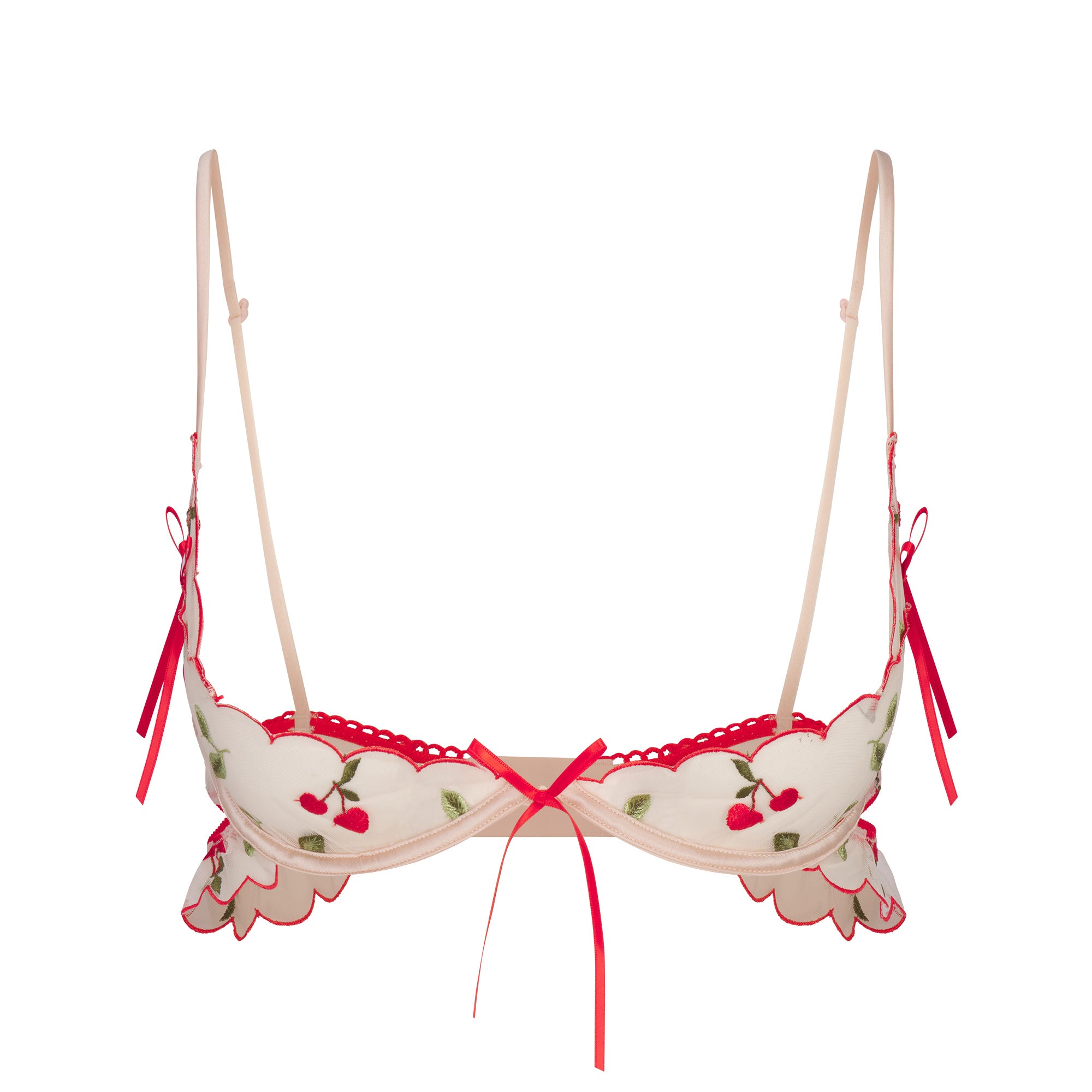 Give them something to blush about. A barely-there, quarter-cup sheer bra in cheeky embroidered tulle, accented by sweet satin bows. Features an underwire construction, adjustable straps, cut-out wing detail, and hook-and-eye closure.