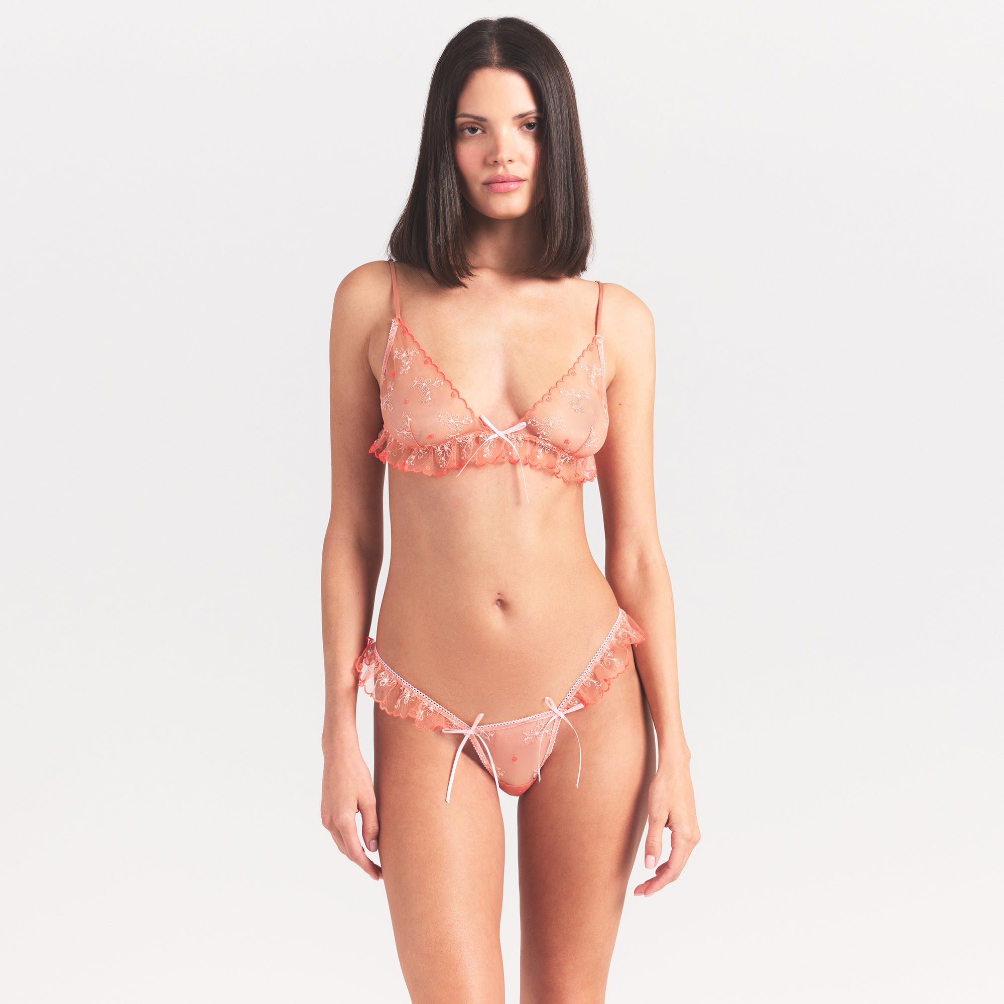 Turn heads and steal hearts. With a skimpy triangle silhouette, this unlined bra in sheer tulle gets a romantic twist courtesy of all-over embroidery and satin bow accents. Features an underbust flounce detail, adjustable straps, and a pull-over design.