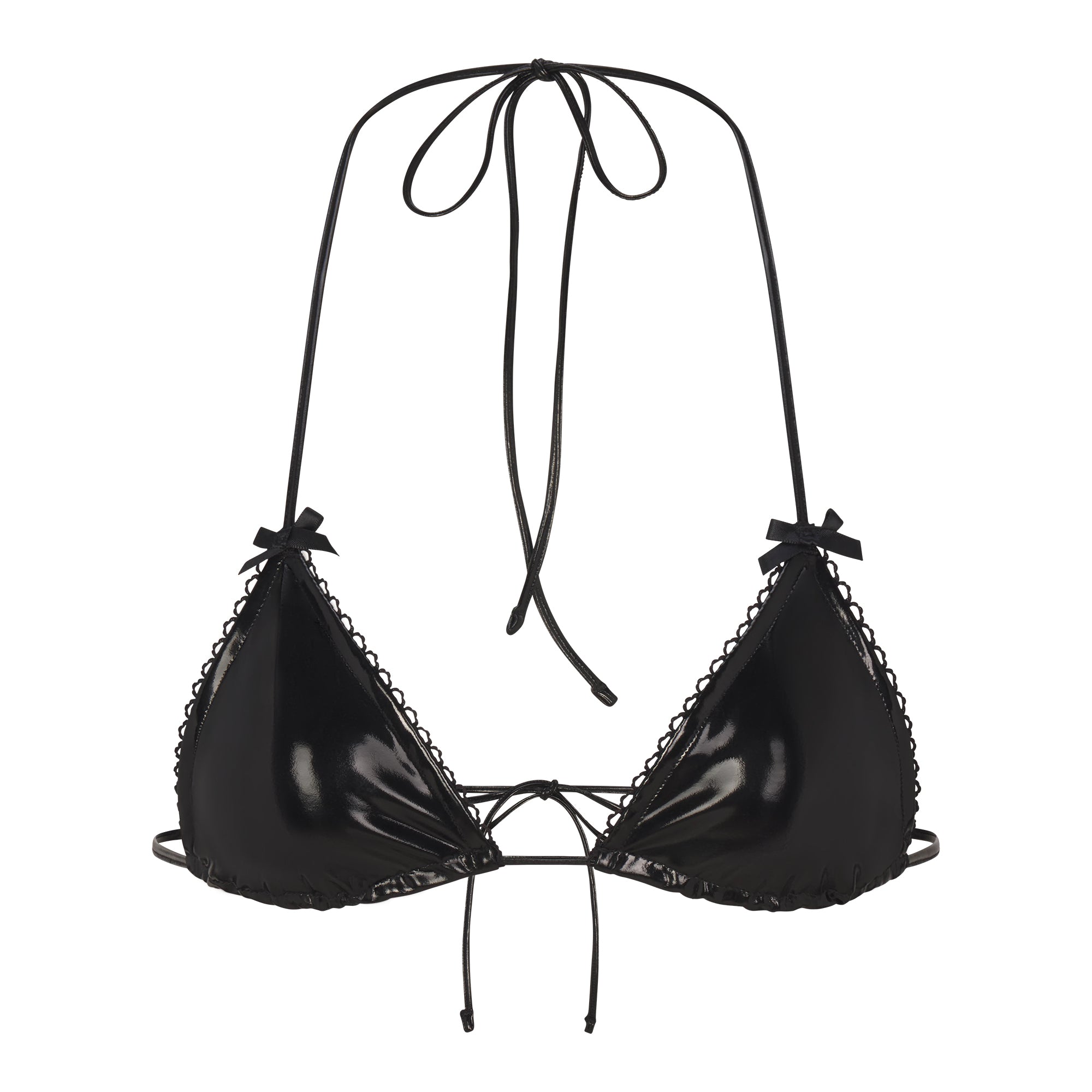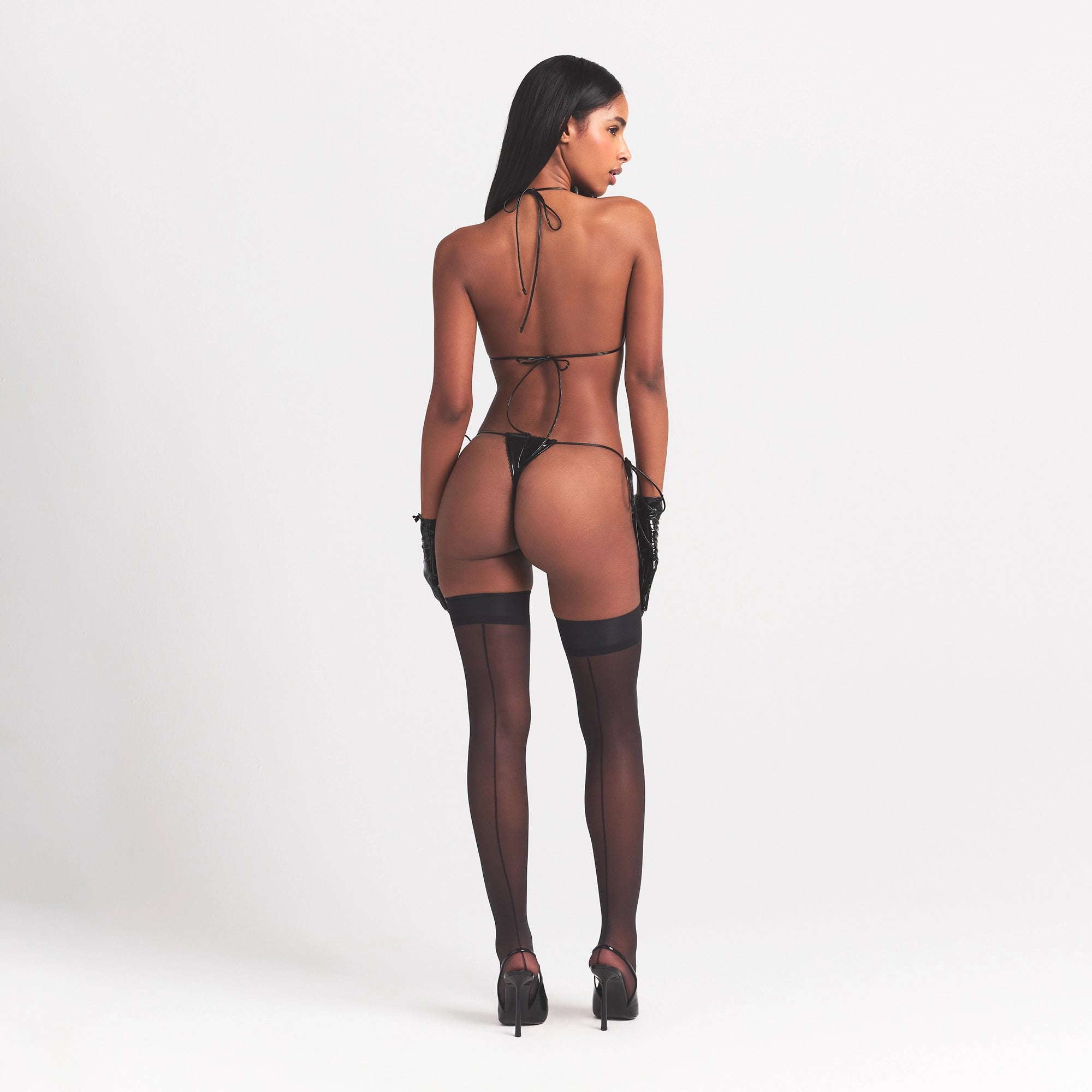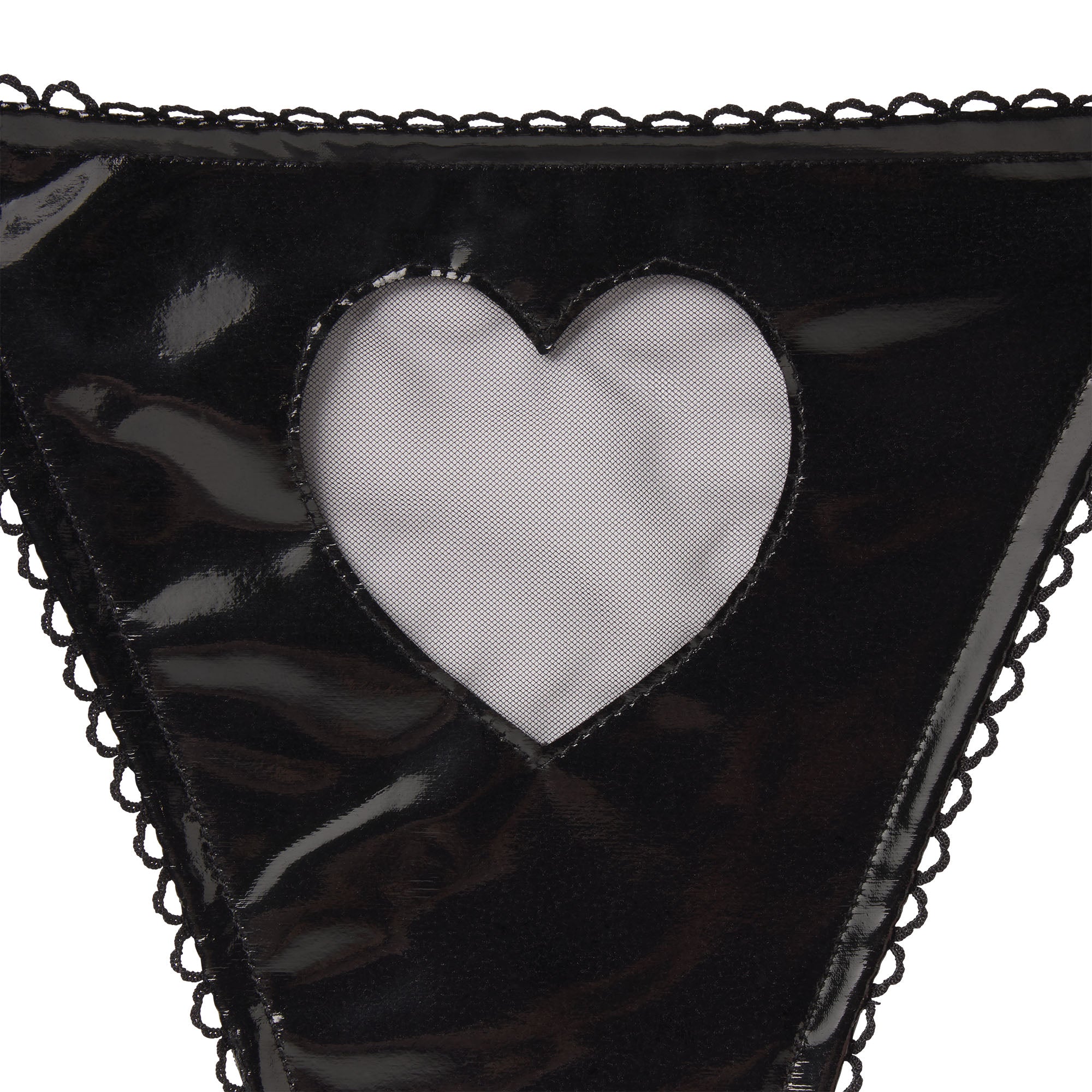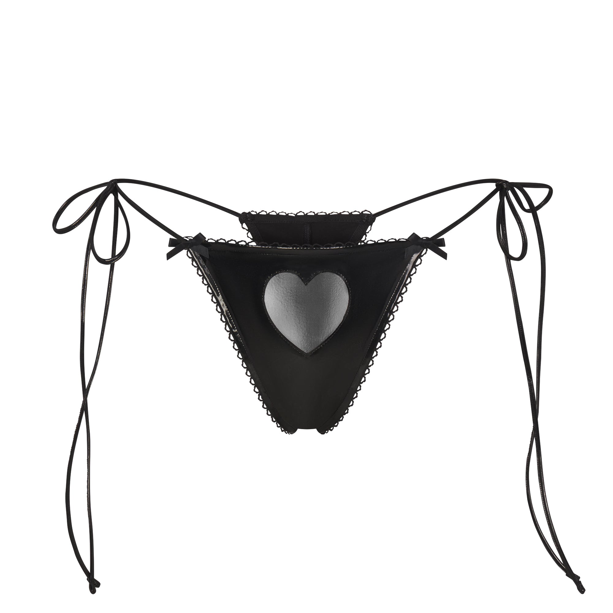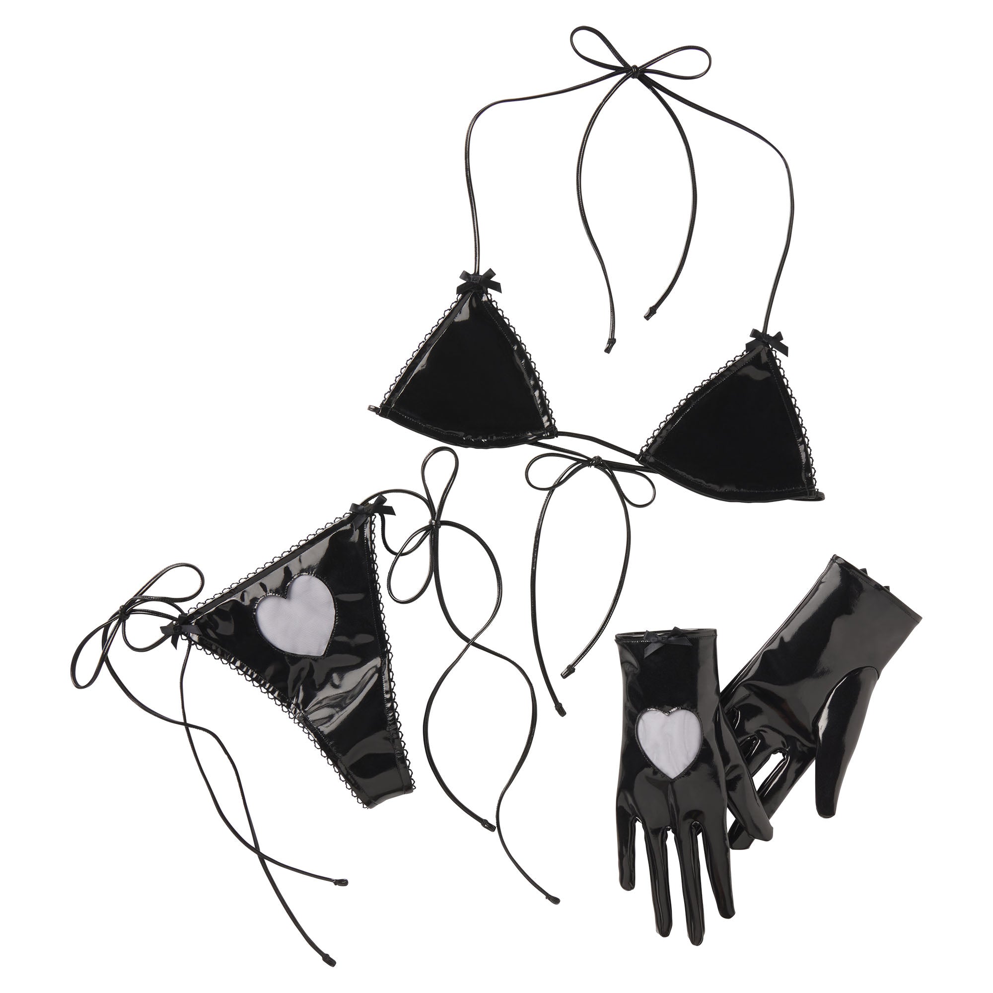Set the mood. This sexy lingerie play kit comes with a triangle bralette, thong, and gloves. The bralette features ties at the neck and back and satin bows at the front straps while the thong features adjustable side ties, satin bows at the waist, and a heart tulle cutout. Gloves come complete with a heart cutout and satin bow detail.